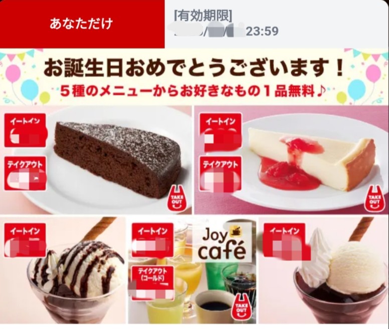 ファミリーレストラン「ジョイフル」では、公式アプリ会員向けに誕生月になると、アプリにデザート1品無料クーポンが配信されます。