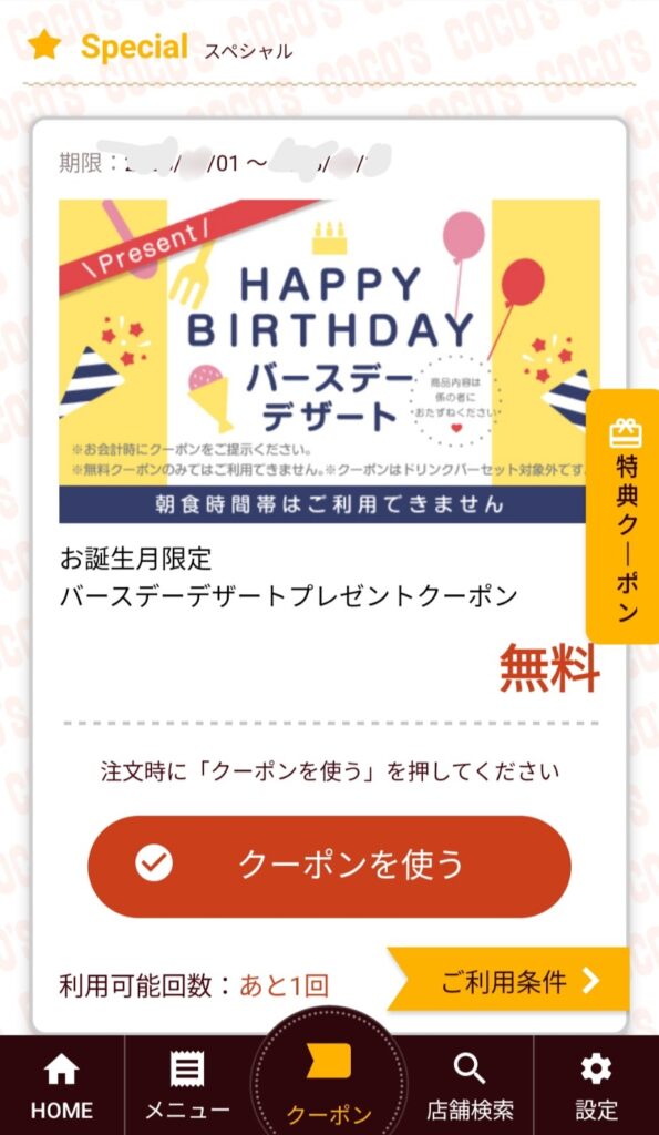 - 利用方法:アプリのクーポンタブから誕生日クーポンを表示。クーポンに表示された4桁番号を卓上タブレットの番号で注文に入力しデザートを注文。