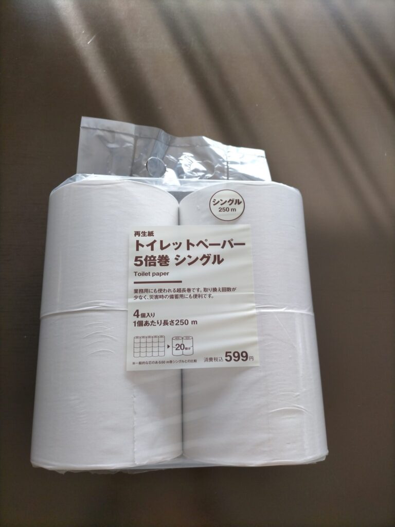 「トイレットペーパー5倍巻きシングル」に興味があったので試しに購入してみました。1パック4ロール入りなのですが、5倍巻きというだけあって、ずっしりと重量感があります。