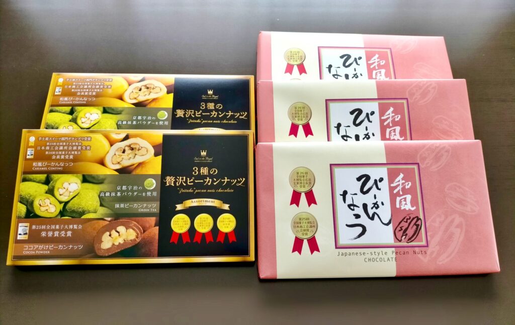 - 和風ピーカンナッツ:キャンディコーティングしたナッツをホワイトチョコで包み、ふわっと軽いキャラメルパウダーをまぶしてある人気シリーズ。